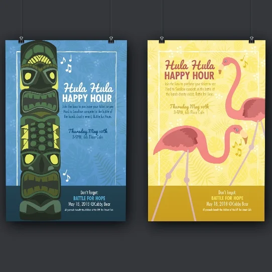 I created illustrations for the company’s hula-themed event, pairing them with custom patterns for backgrounds that helped keep the large range of piece looking cohesive. Overall the event was a huge success- over $4500 were raised and a majority of the tickets were sold at the happy hour fundraiser.